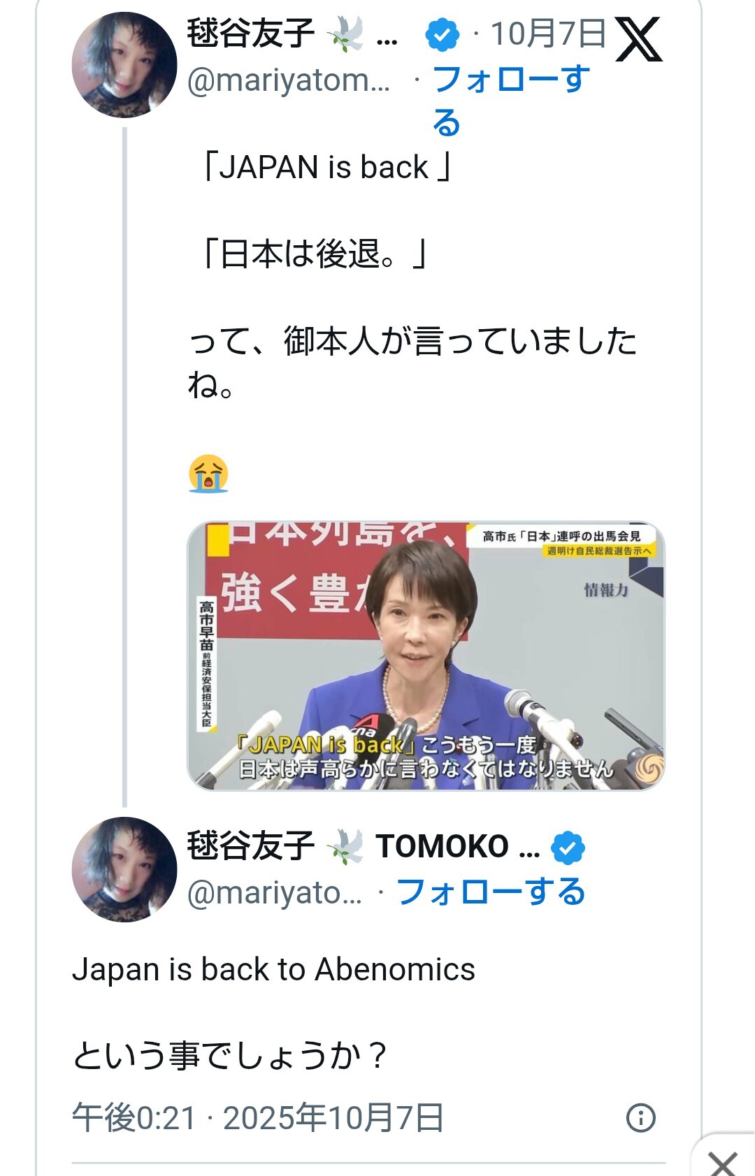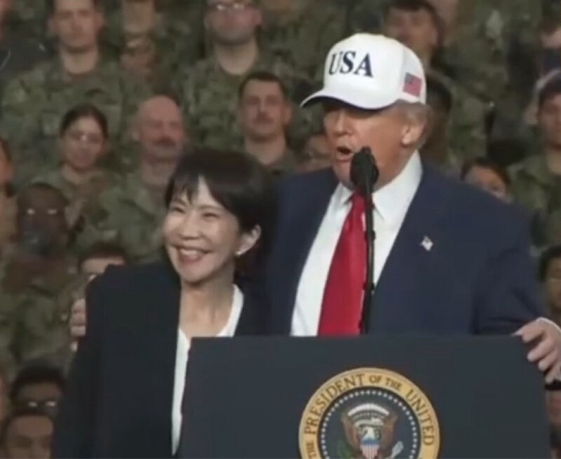 具体的な記述はなかったが、28日に米トランプ大統領と初の日米首脳会談を行った自民党の高市早苗首相(64)へのポストとみられる。高市氏は28日午前、来日したトランプ氏と初の首脳会談を行い、午後はトランプ氏とともに横須賀基地を視察した。横須賀基地でトランプ氏がスピーチした際、高市氏は表情を崩しながらサムアップで応じた。また、トランプ氏から肩を引き寄せられる場面もあった。