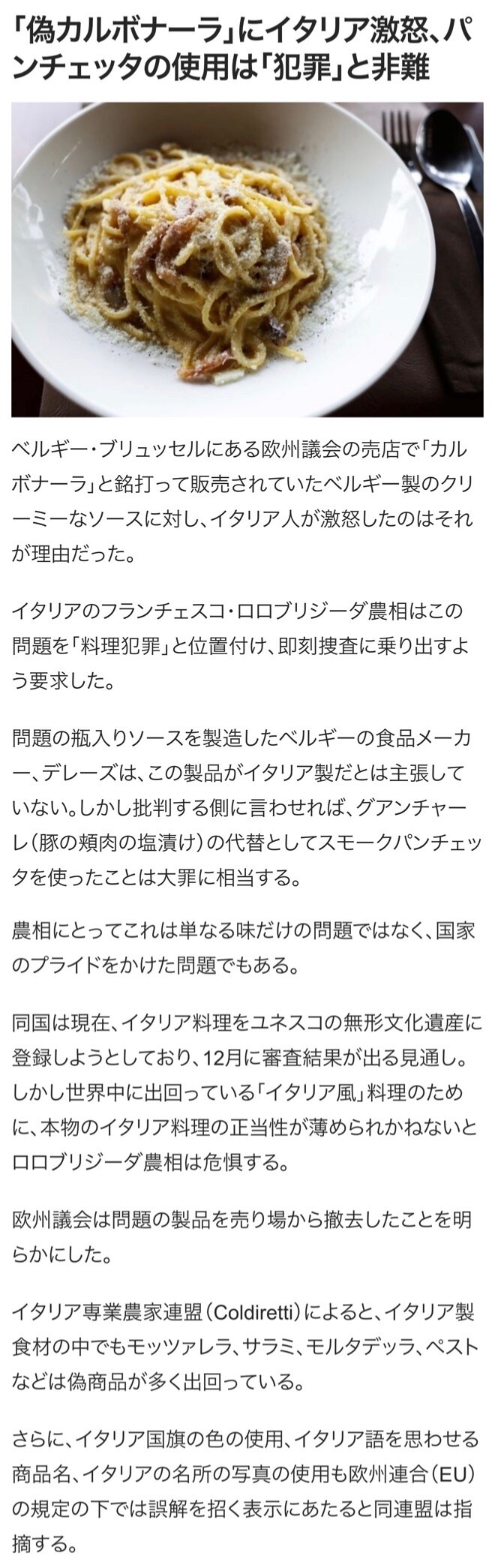 ベルギー・ブリュッセルにある欧州議会の売店で「カルボナーラ」と銘打って販売されていたベルギー製のクリーミーなソースに対し、イタリア人が激怒したのはそれが理由だった。