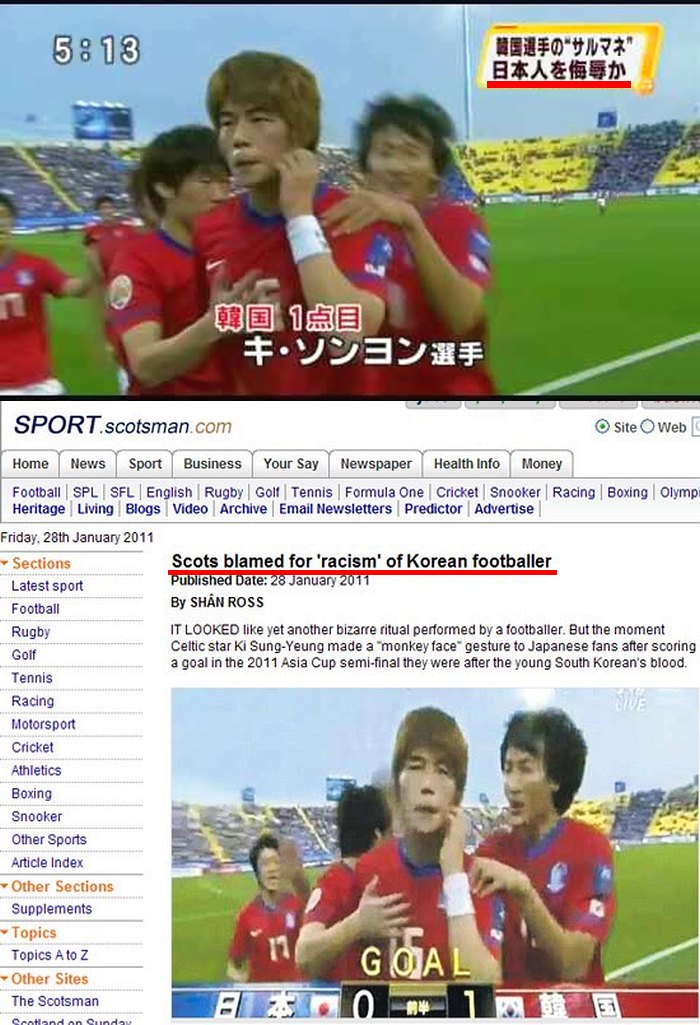 ■2011年のサッカー日韓戦で、韓国選手がゴールした時に「猿まね」パフォーマンスをして人種差別だと批判される。