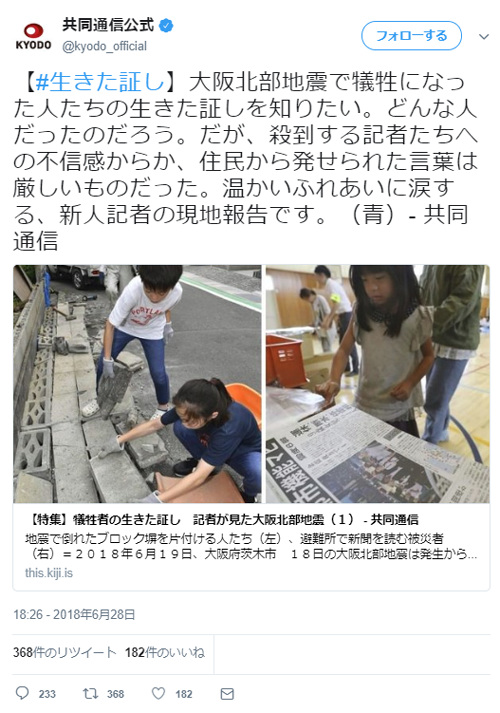 取材内容は6月18日に起きた大阪北部地震の被害にあった方を訪れ話を聞くというもの。共同通信が行った取材はマンションの