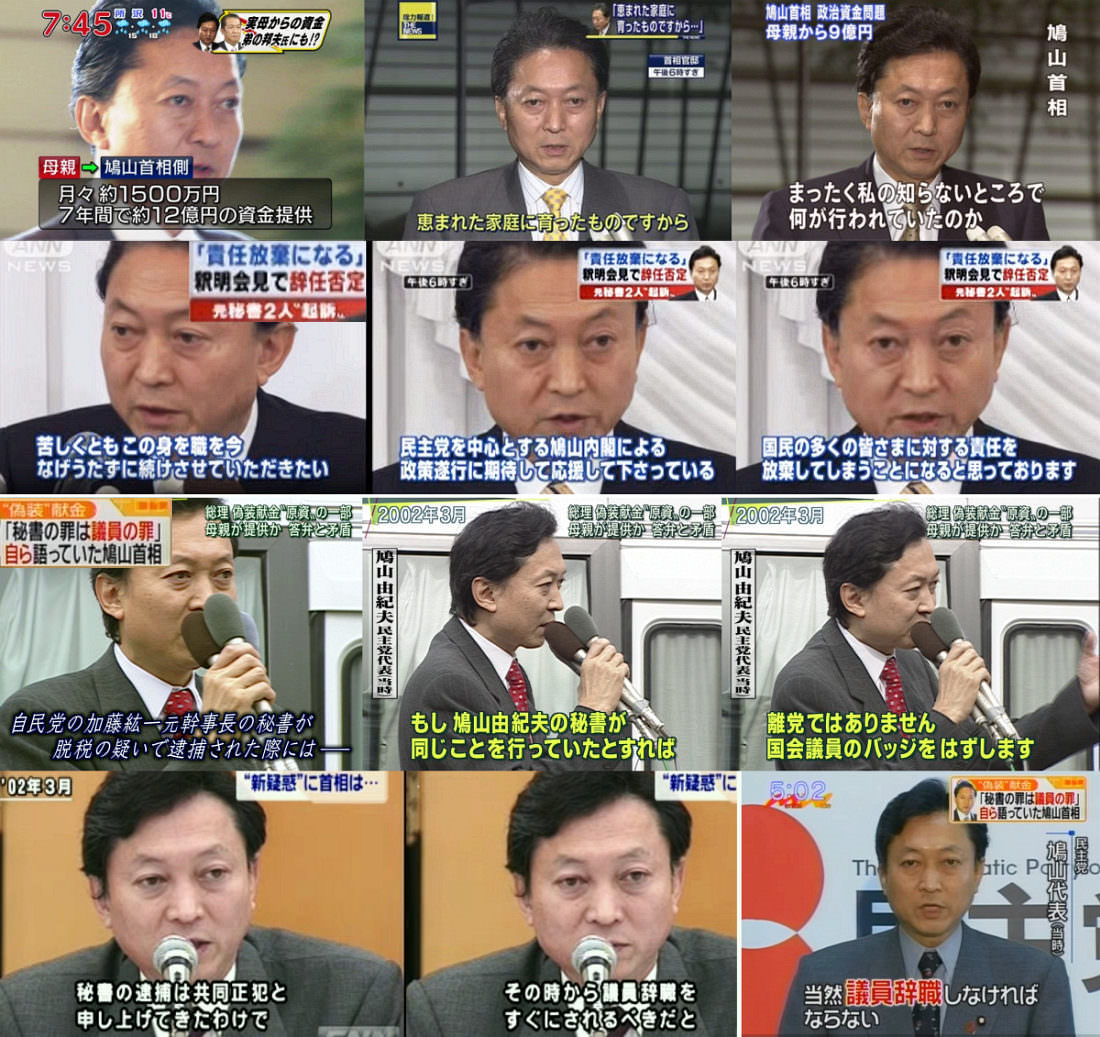 → 鳩山内閣で3億円の匿名献金と12億脱税が発覚 → 「秘書がやった」と言い訳して辞職せず