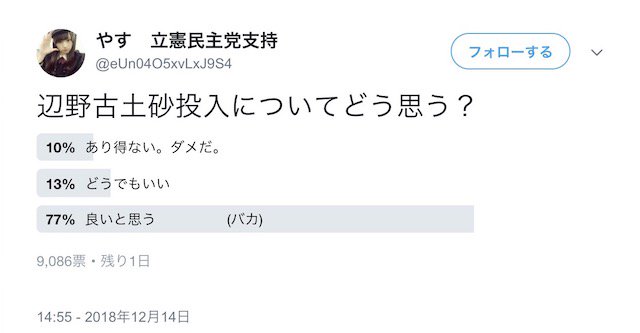 立憲民主党の支持者がSNSでアンケート「辺野古土砂投入についてどう思う?」 → 結果…