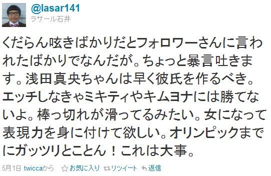 「浅田真央ちゃんは早く彼氏を作るべき。エッチしなきゃミキティやキムヨナには勝てないよ。