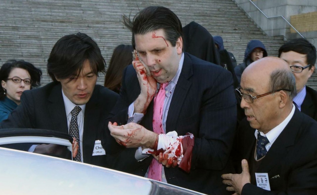マーク・リッパート駐韓国大使が刃物を持った韓国人の男に襲撃され、右あごの上に約11cm、深さ約3cmの傷と左腕を貫通する重症を負った。