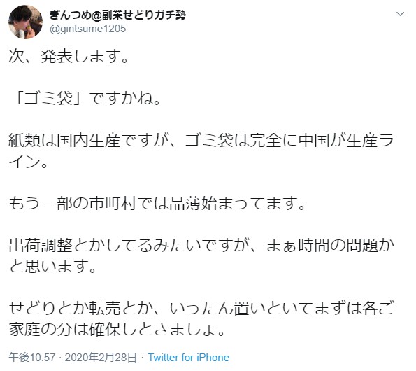 コイツの問題は品薄煽って自分でメルカリでトイレットペーパー売ってる件