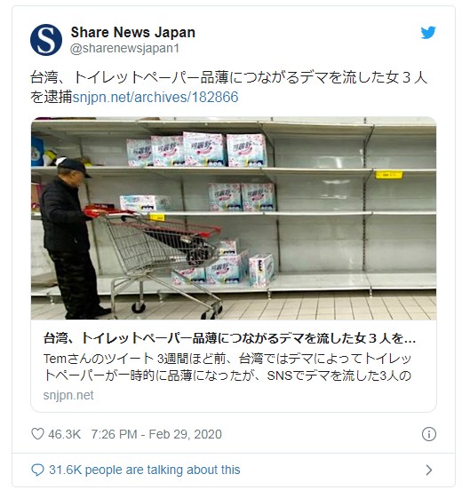 台湾の法律ではデマを広めた人に3年以下の懲役または100万円罰金を罰することができる。