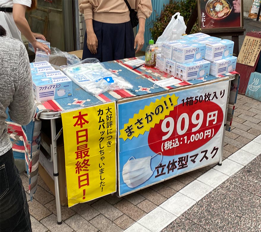 ここ数日、東京都内では50枚は約1500円ほどで販売されていたが、ついに1000円以下のマスクが登場。50枚909円で販売する店舗が出てきたのである。