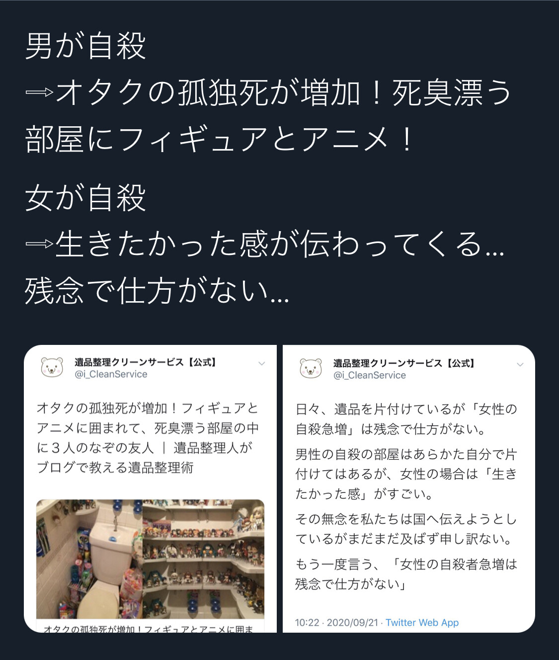 男は片付けてるから覚悟の死、女は片付けてないから衝動的な死、そういうことやないかなぁ生々しさがあるというか(´・ω・`)