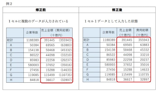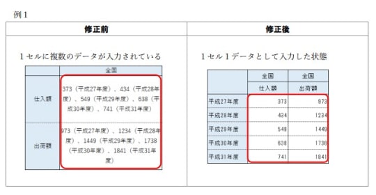 役所の「Excel」データには、1つのセルにいくつものデータ(カンマで区切ったリストや、カッコで括った補助データ)が詰め込まれていることが少なくありません。これは計算や並び替え、コピー&ペースト、グラフ化といった加工・編集作業の支障になります。