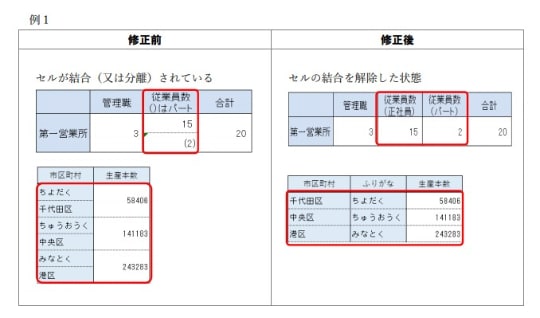 お役所「Excel」でもっとも嫌われる慣習の筆頭は、“やたらセルを連結したがる”ことです。加工の際にわざわざセルの連結を解除する必要があり、面倒この上ない……。1件のデータは横1行で表記し、セルの結合または不必要な分離を行わないのが基本です。