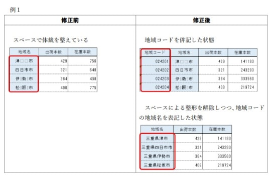 そのほかにも、数式を利用している場合は数値データに置き換える、不要なシェイプを挿入して体裁を整えない、データの単位を記載する、和暦には西暦を併記する、地域名称には“統計に用いる標準地域コード”を併記する、空白列などでデータを分断しない、1つのシートに複数の表をいれない、といった指針が示されています。役所特有のルールも一部含まれていますが、一般的な企業でも心掛けた方がいい作法も少なくなく、結構参考になるのではないでしょうか。