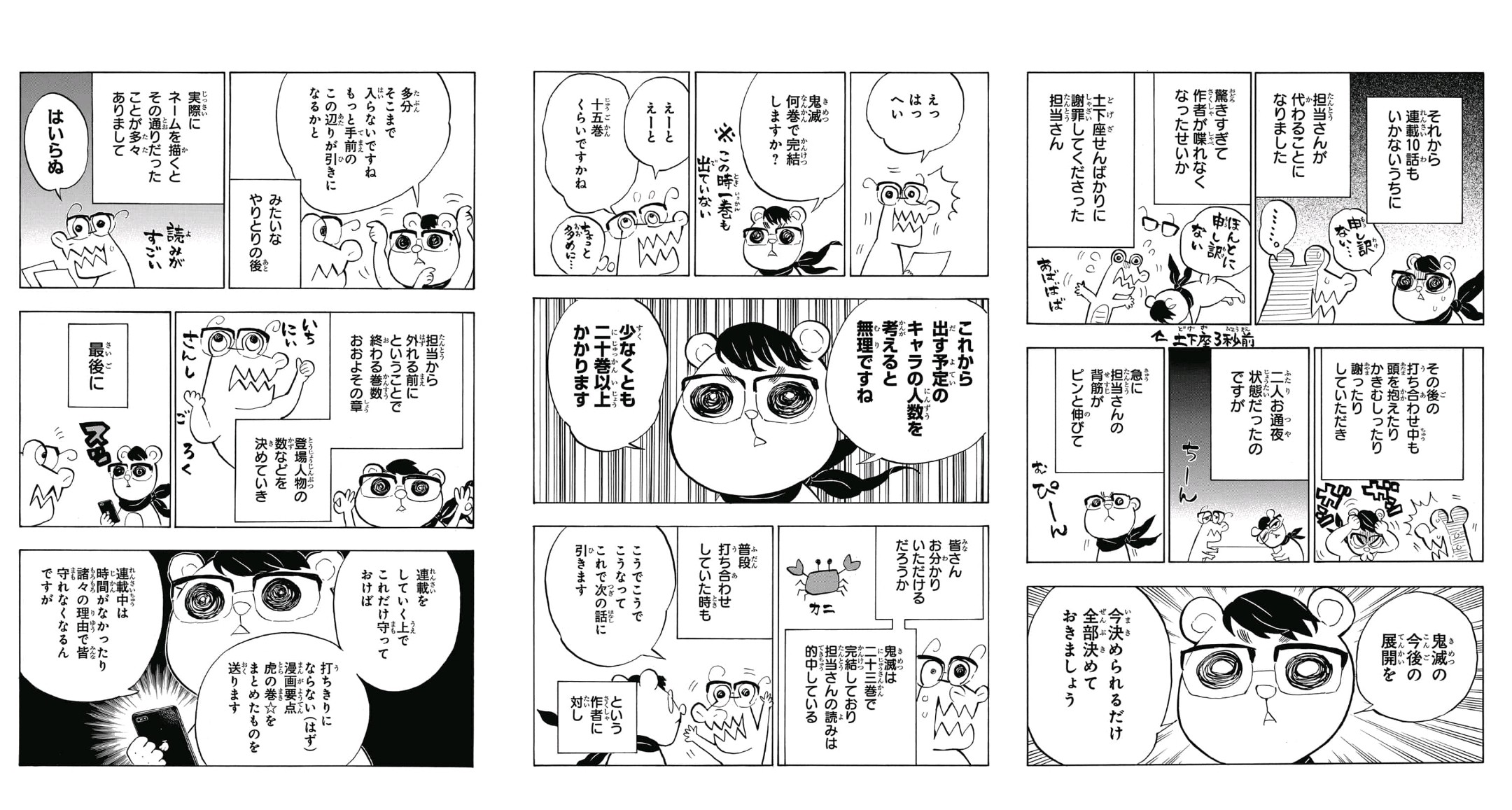 担当編集が「鬼滅の刃」の初代担当を務めさせて頂いた縁でツイートします。吾峠先生、4年半に渡る連載お疲れ様でした!「呪術廻戦」の打ち合わせでは、芥見先生とよく鬼滅の話で盛り上がっていました。まずはゆっくり休んでください。本当にお疲れ様でした!