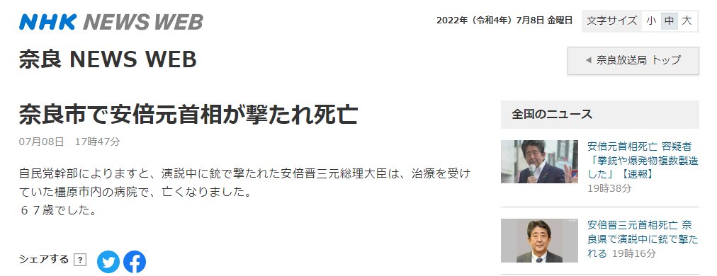 7月8日、午前11時半ごろ奈良県にある近鉄「大和西大寺駅」駅付近で、演説中の安倍晋三元総理が銃で撃たれ、心肺停止の状態で病院へ搬送され治療を受けていましたが、死亡が確認されました。
