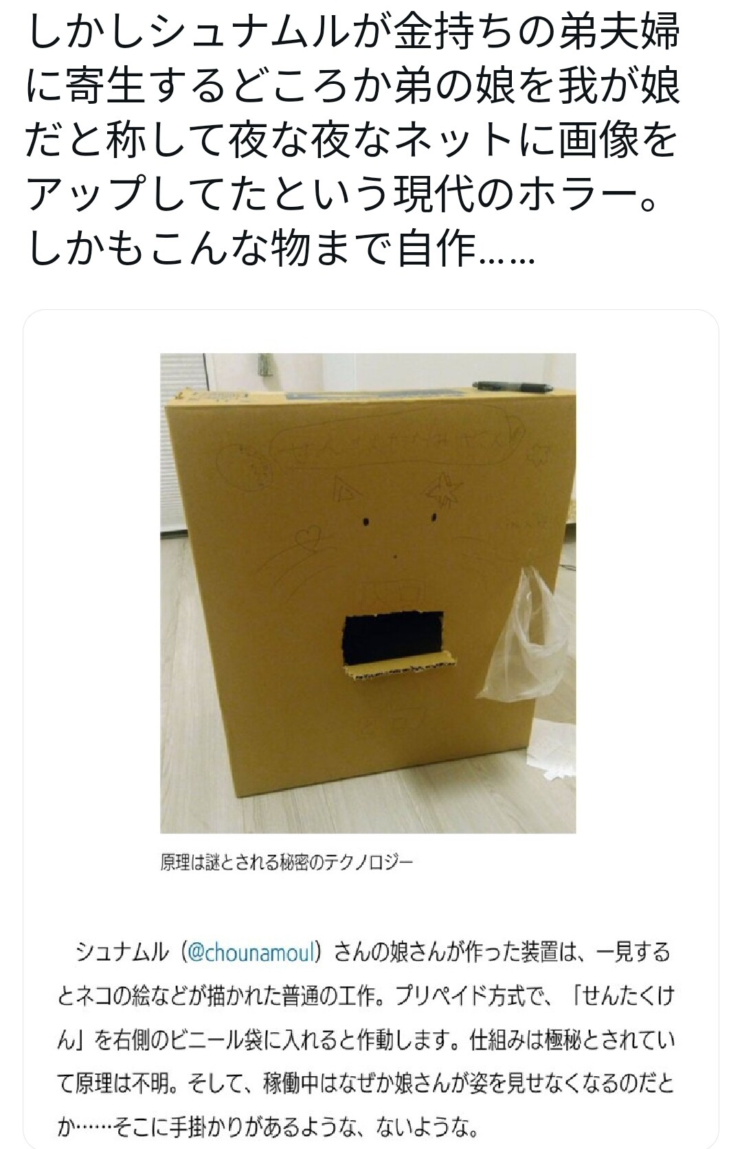 実際は弟夫婦に寄生するニートだったと特定されたうえにツイッターが親族にバレて垢消し逃亡したらしい(´・ω・`)