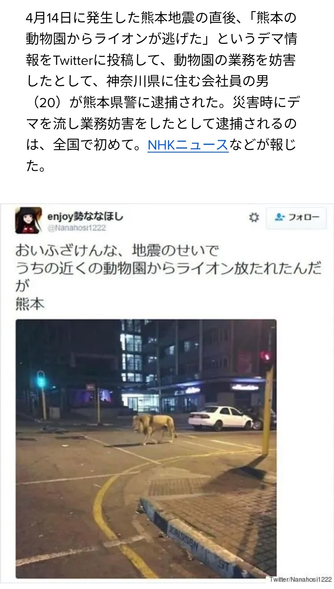 4·î14Æü¤ËȯÀ¸¤·¤¿·§ËÜÃϿ̤Îľ¸å¤Ë¡Ö·§ËÜ¤ÎÆ°Êª±à¤«¤é¥é¥¤¥ª¥ó¤¬Æ¨¤²¤¿¡×¤È¤¤¤¦¥Ç¥Þ¾ðÊó¤òTwitter¤ËÅê¹Æ¤·¤Æ¡¢