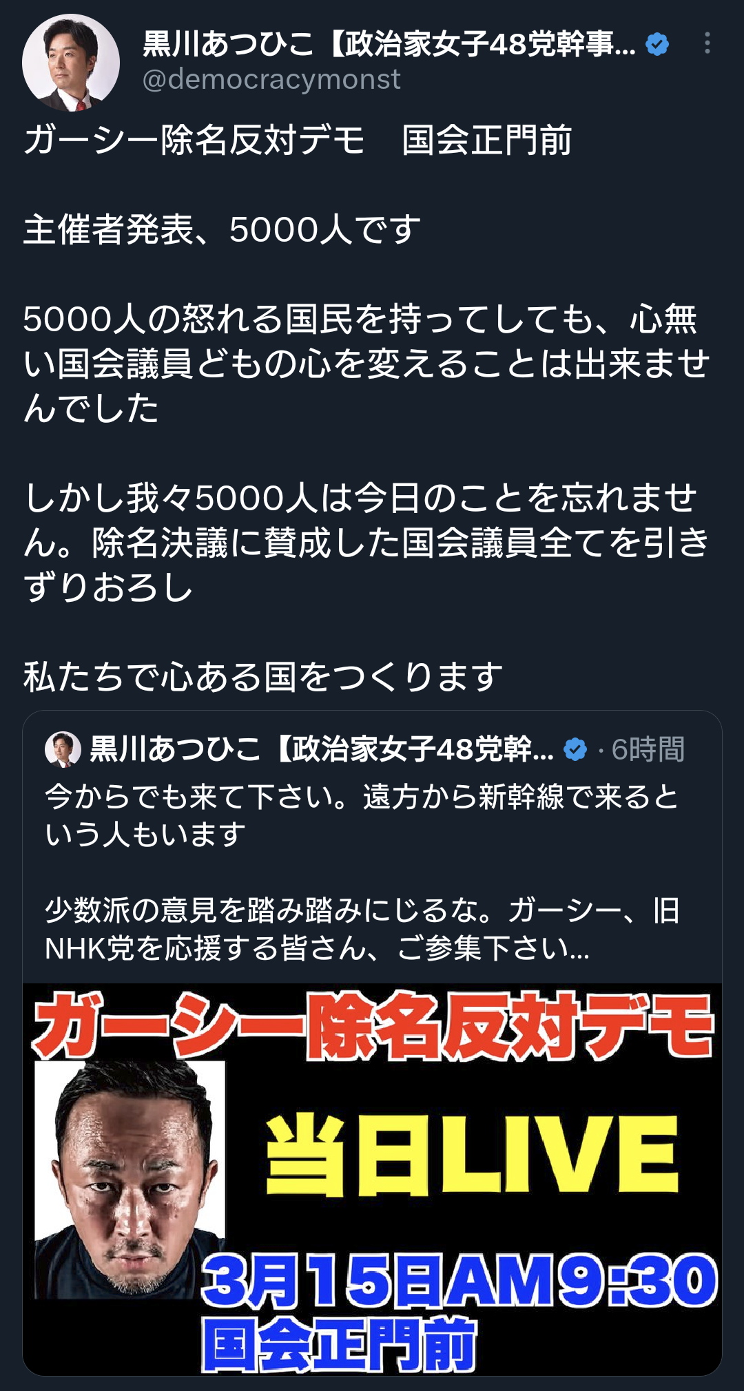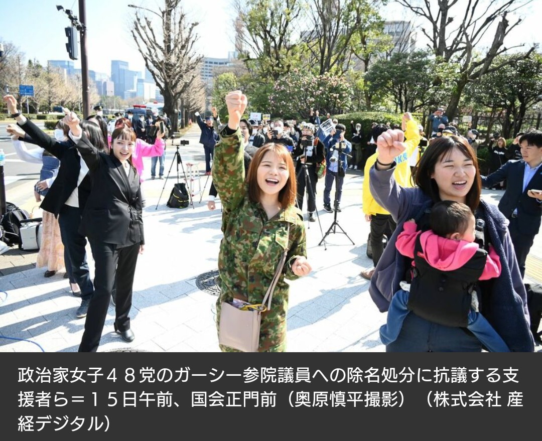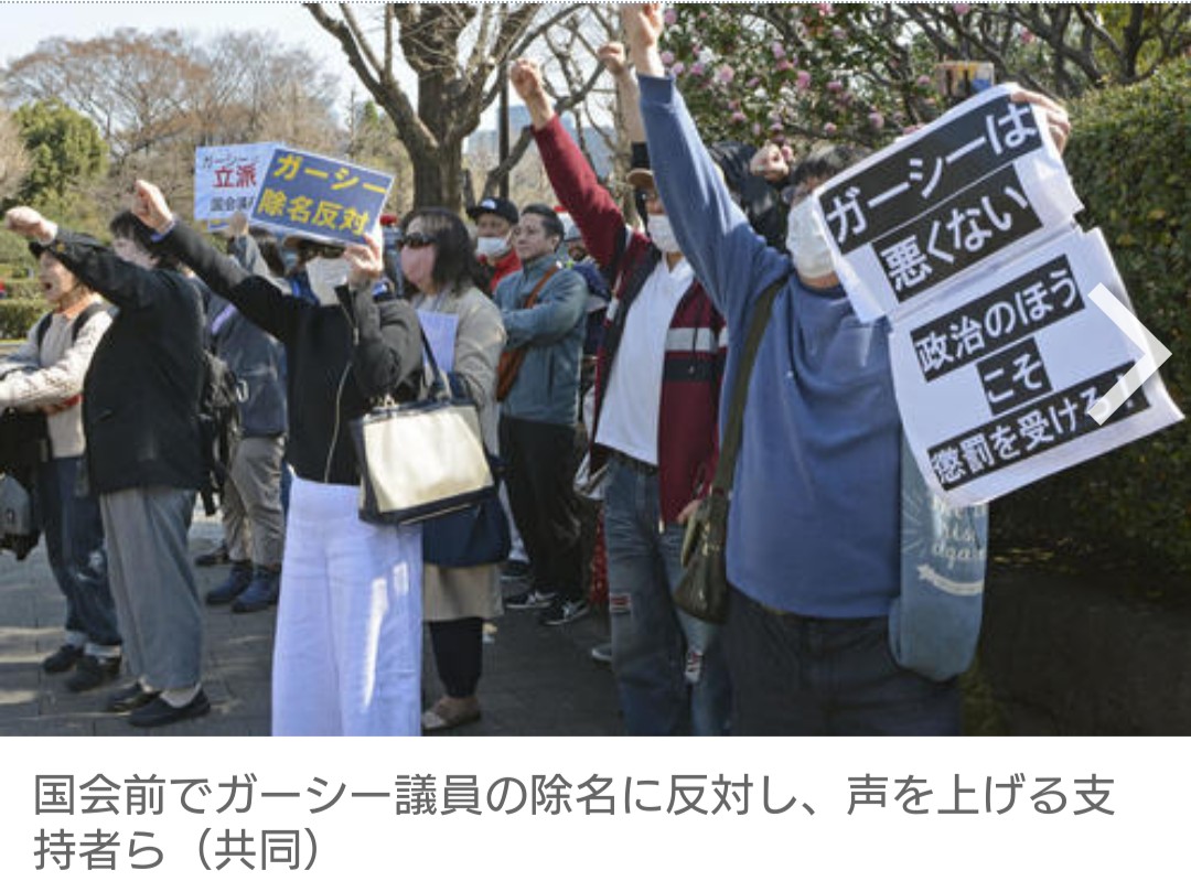昨年7月の参院選で初当選後、国会欠席を続けてきた政治家女子48党(旧NHK党)のガーシー(本名・東谷義和)参院議員に対し、参院が15日、最も重い「除名」の懲罰を科すことを本会議で決めたのを踏まえ、国会正門前ではガーシー氏の支援者による「除名反対デモ」が行われた。