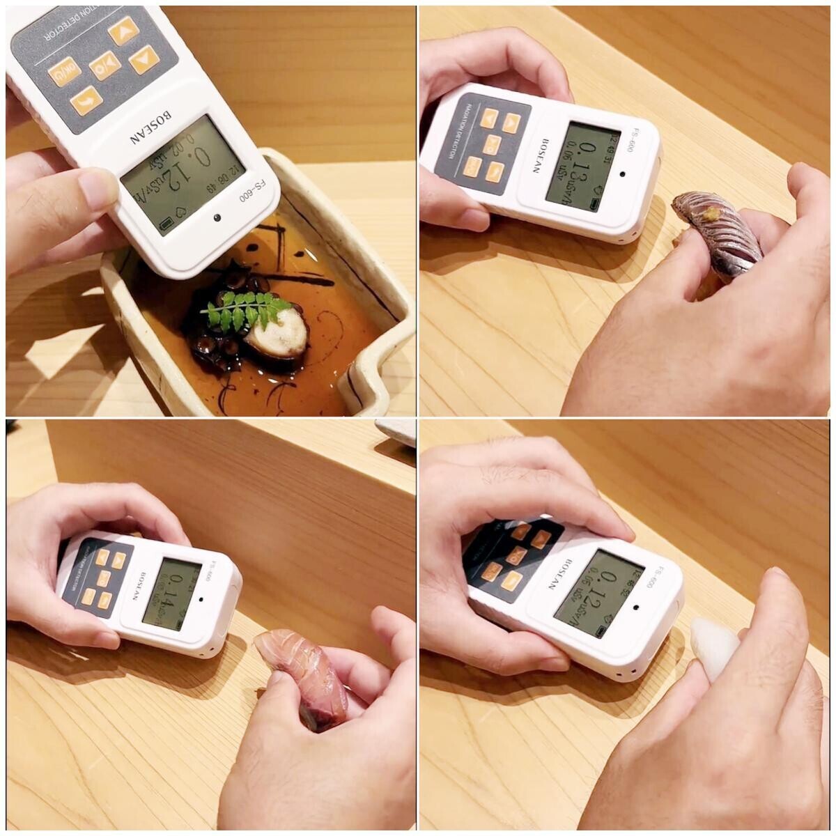 在日中国人でインフルエンサーの男性が東京・六本木の高級すし店を訪れ、出されるすしを一つひとつ放射線測定器を使って