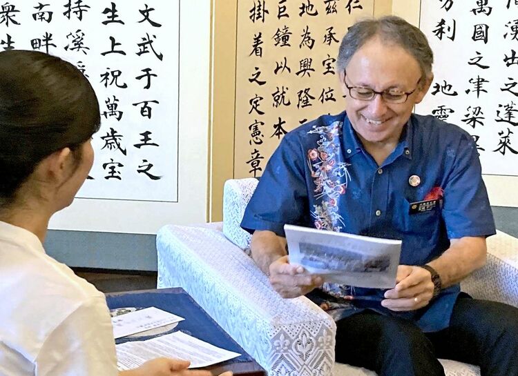 全国の高校生と平和学習・活動などを展開する「沖縄高校生平和ゼミナール」のメンバーは16日、県庁内で玉城デニー知事と面会し、「私たちの未来に軍事基地ではなく、希望の海を残して」と訴えた。名護市辺野古の新基地建設を巡り、国が提起した代執行訴訟に応訴すると明言した知事に対し、支持していることを伝えた。