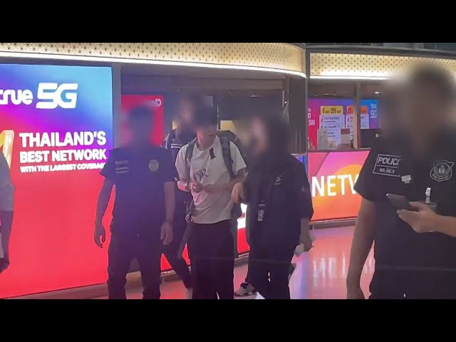 警察官らに囲まれてタイの空港を出てくる様子をFNNのカメラがとらえた。