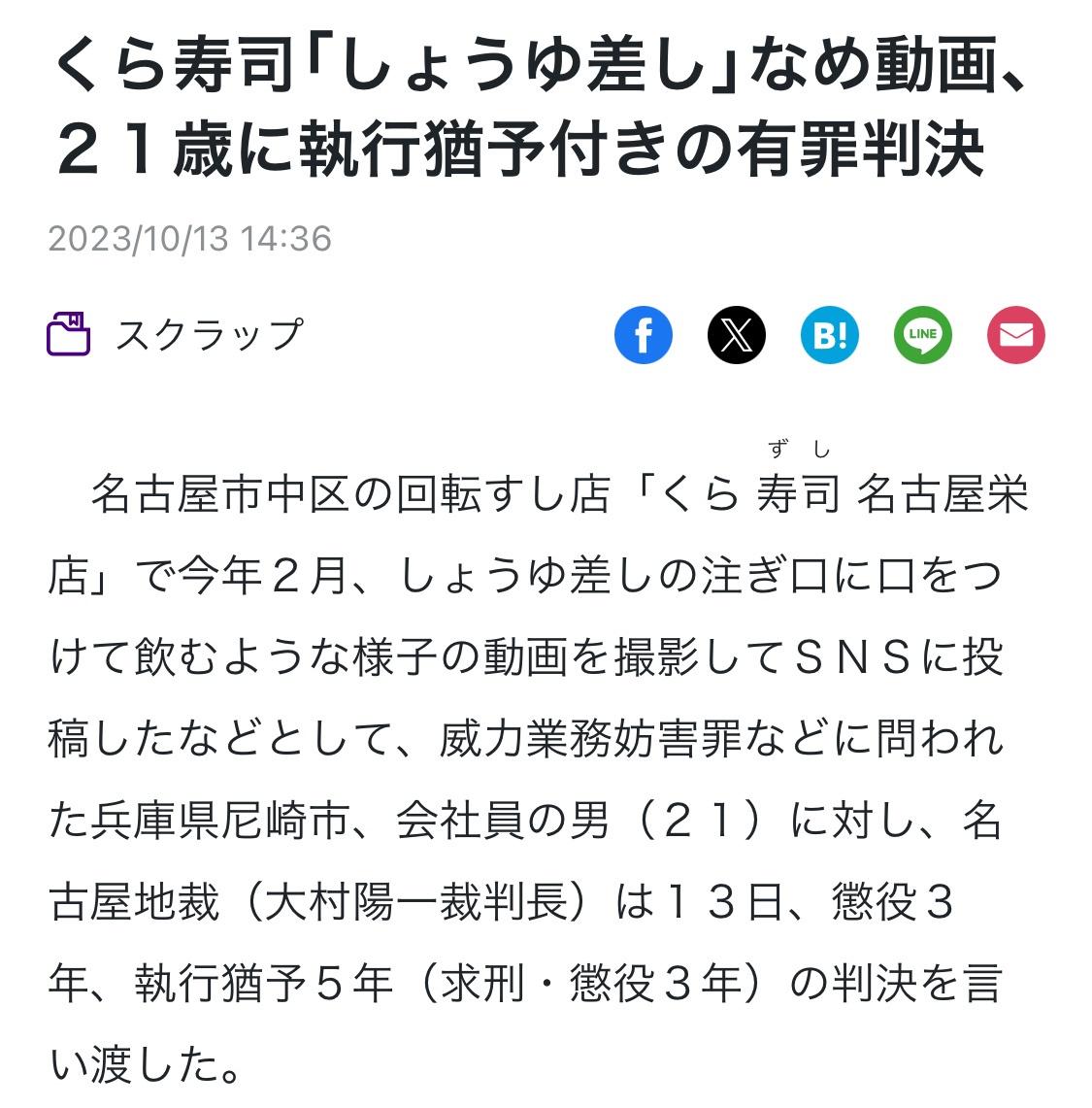 兵庫県尼崎市の会社員、吉野凌雅被告(21)はことし2月、名古屋市内の「くら寿司」の店舗で、テーブルに置かれたしょうゆさしの注ぎ口に直接、口をつけたように見える動画を撮影してSNS上に投稿し店の業務を妨害したとして威力業務妨害の罪に問われたほか、15歳の少女を東京都内から連れ出したなどとして営利目的の誘拐の罪に問われました。