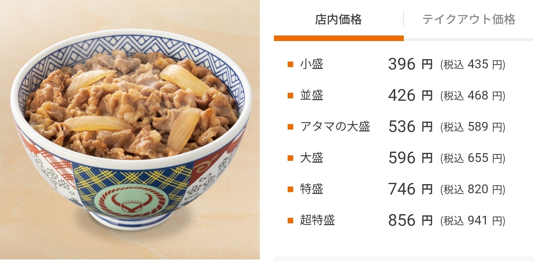 値段、超特盛りは並みの2倍だけど、