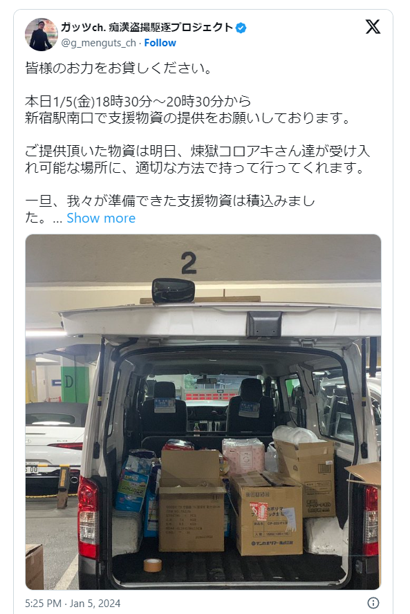 逮捕されてからガチで金がありません皆様レンタカー代、ガソリン代、食事代、ホテル代、生活費支援お願いします」と投稿した。