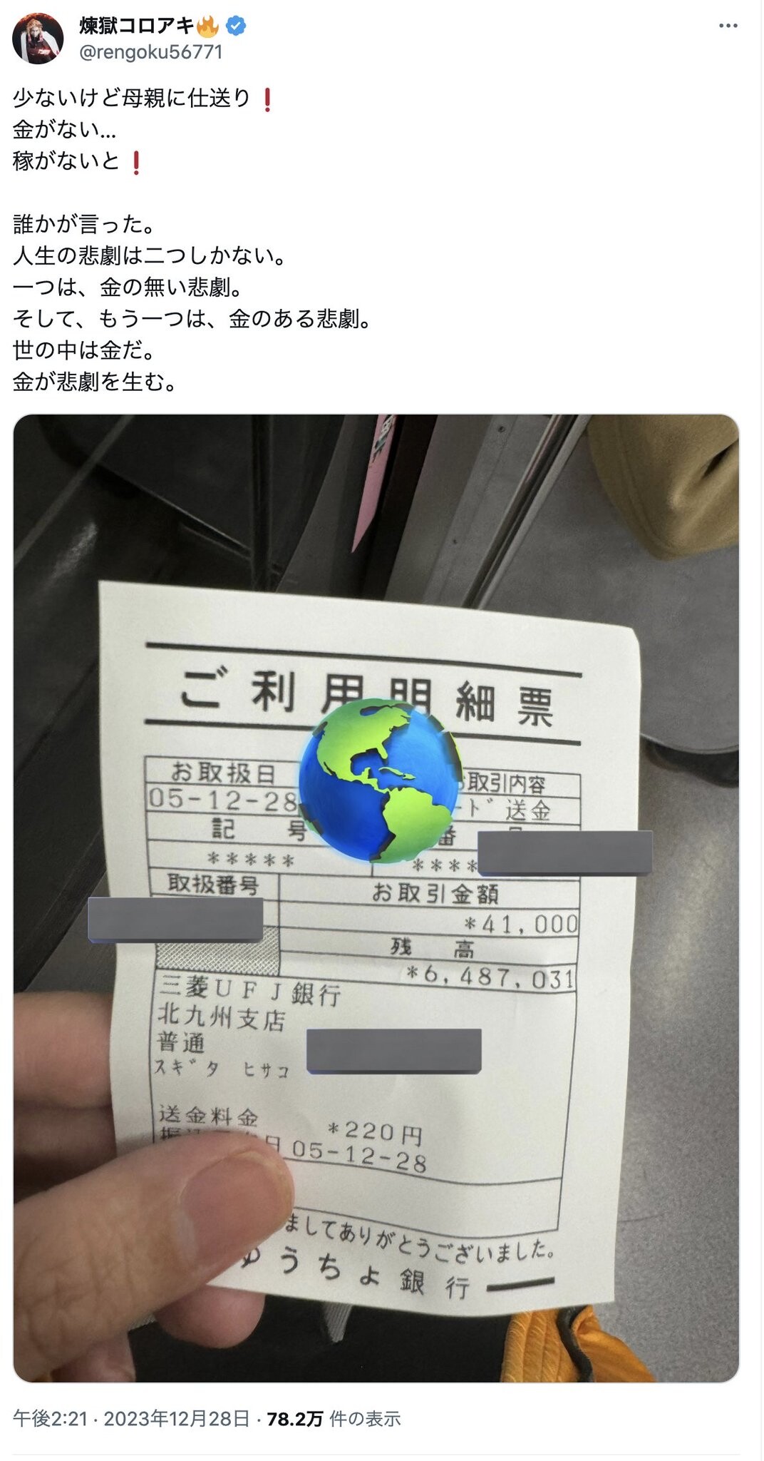 銀行の口座番号と3万8847円と記された残高の写真を掲載し、杉田氏自身への寄付を呼びかけた。