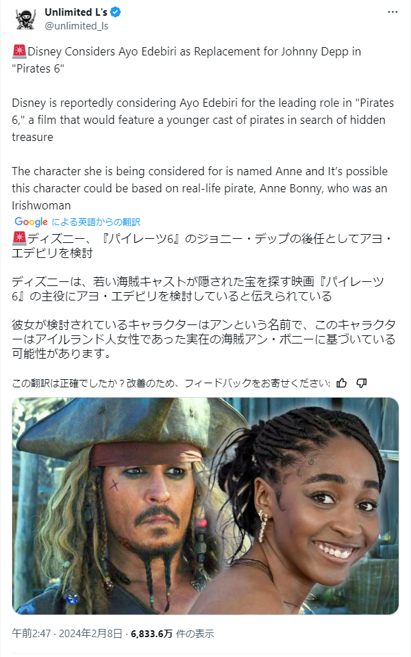 別スレ:パイレーツオブカリビアン6「ここで黒人をひとつまみ...w」ジョニーデップの後任に黒人女性を起用