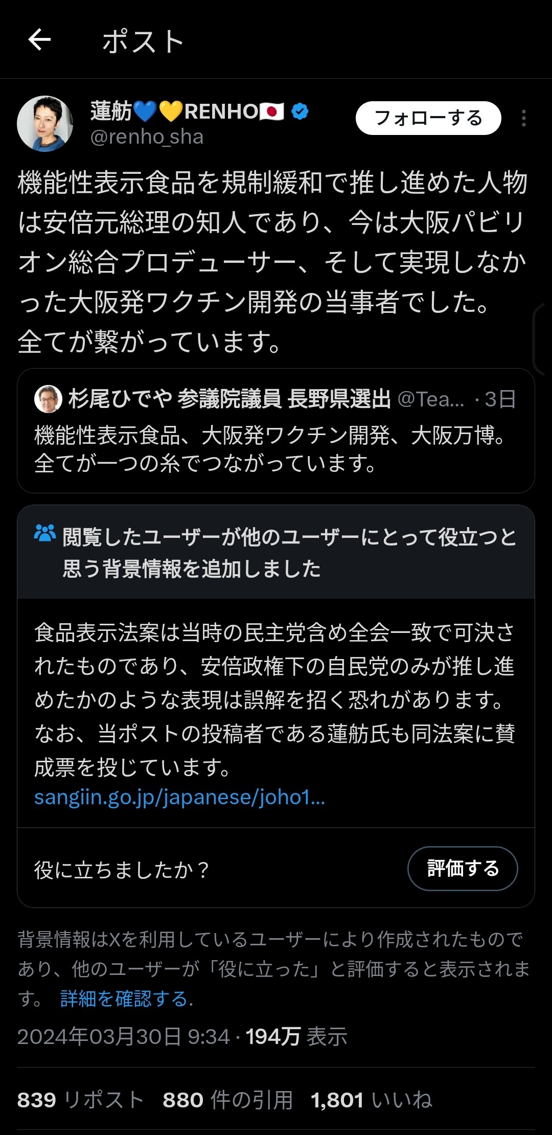 「蓮舫氏の投稿は立憲・杉尾秀哉議員の《機能性表示食品、大阪発ワクチン開発、大阪万博。全てが一つの糸でつながっています》という3月29日の投稿を引用したものです。