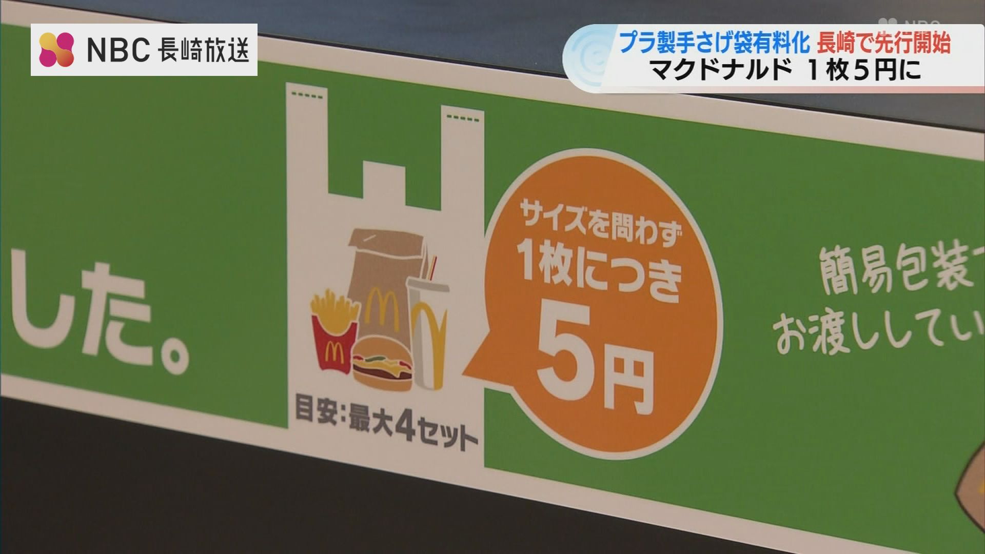 長崎県内のマクドナルドの23店舗では、全国に先駆けて、3日から持ち帰り用のプラスチック製の手提げ袋が有料となりました。