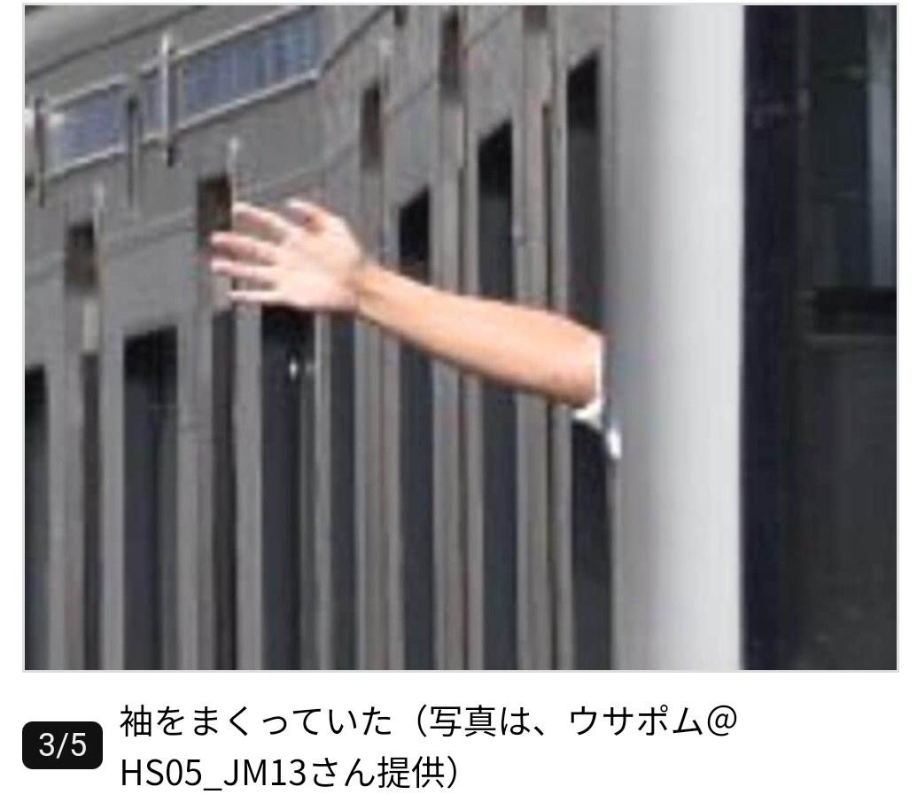 右カーブを曲がるタイミングで、前から1、2車両目ぐらいの右側の窓から白い上着の袖をまくった右手を出している。