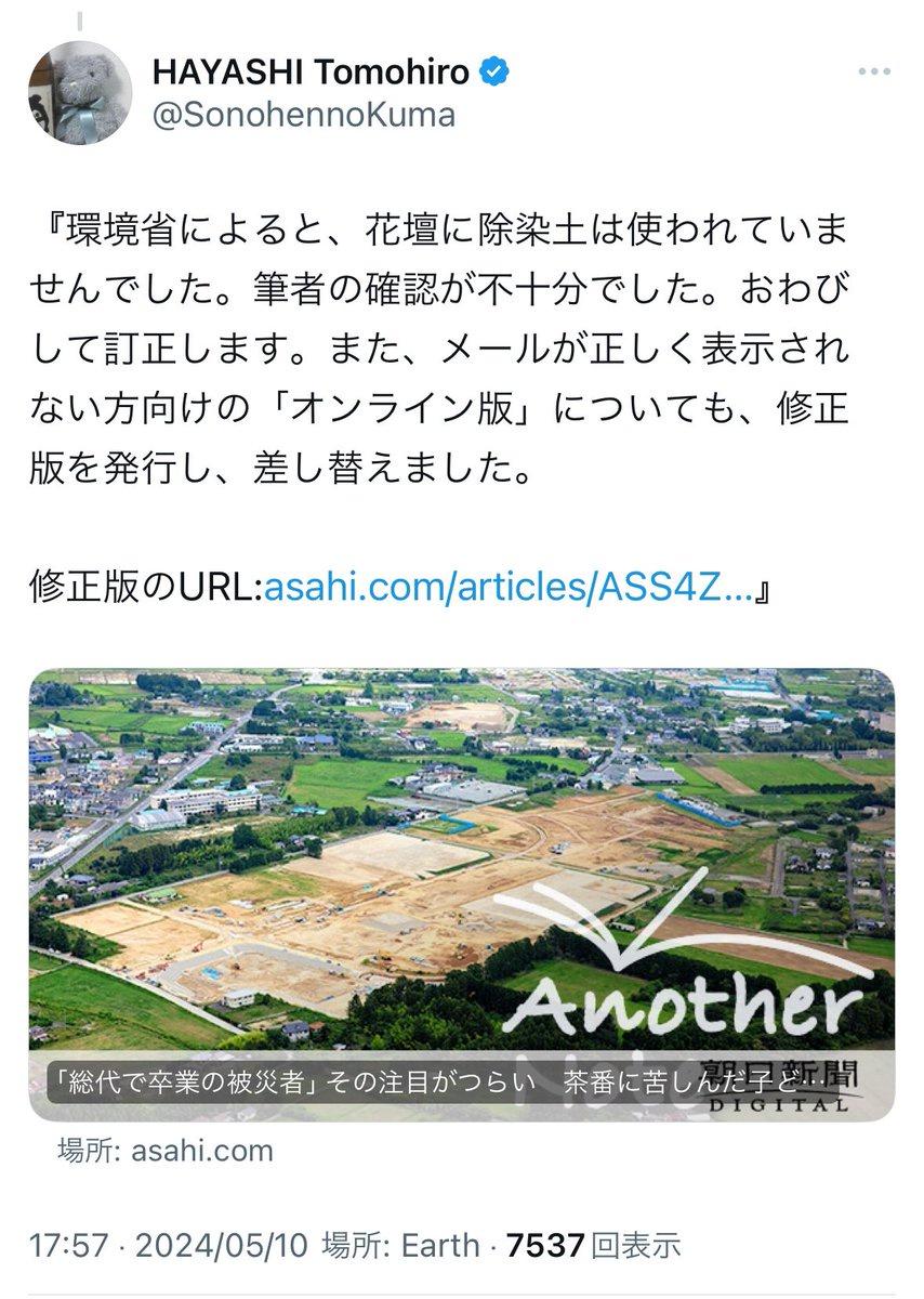 ジャーナリストの林智裕氏が朝日新聞に対して質問状を提出。「花壇に花植えはあったが除染土を用いた事実はない」との回答が得られています。なぜ事実に基づかない捏造報道をしたのでしょうか。その理由をお答えください。」