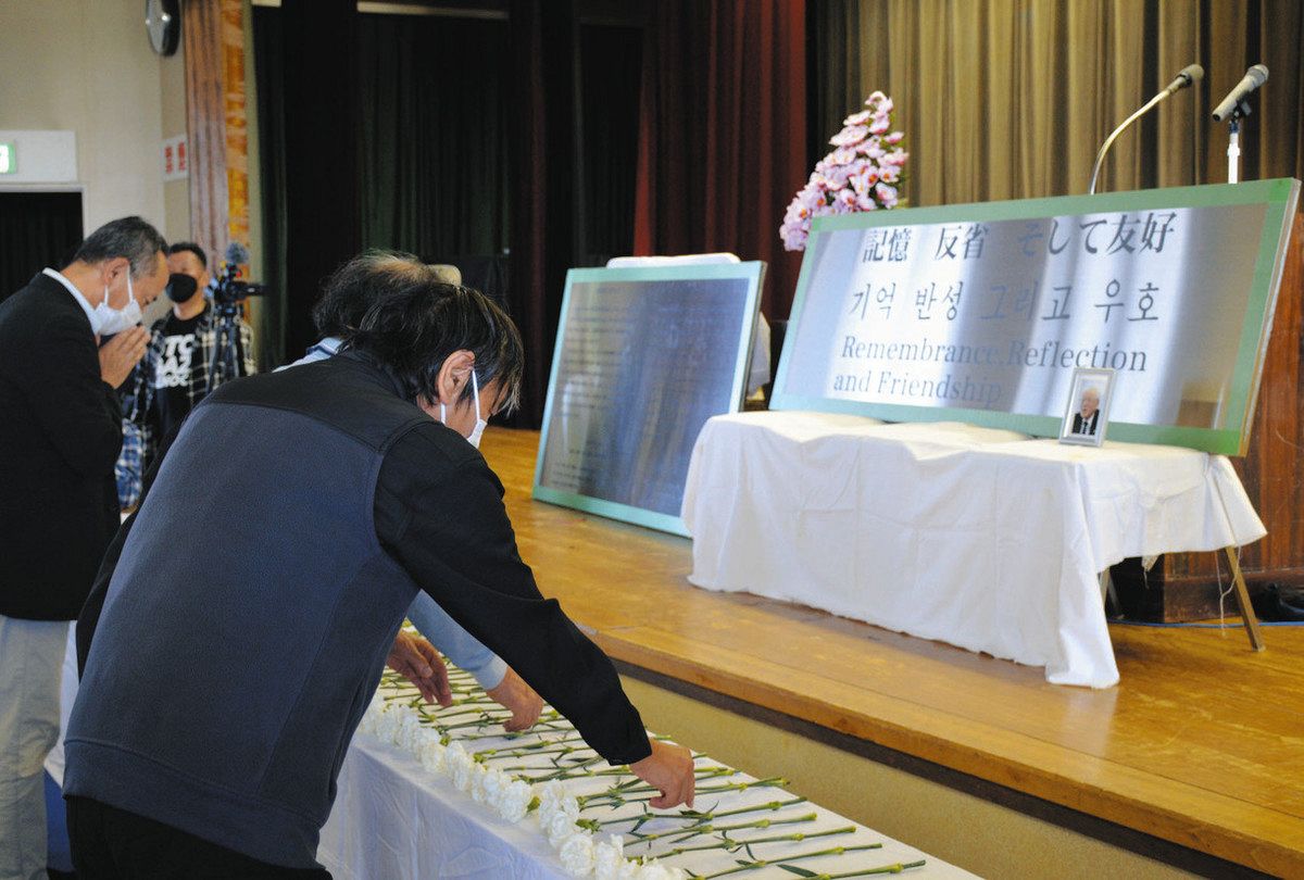 宮川邦雄共同代表らが「県の代執行は稚拙な暴挙。反省と友好親善の重要性を改めて共有したい」とあいさつ。約200人の参加者はプレートに向けて献花した。