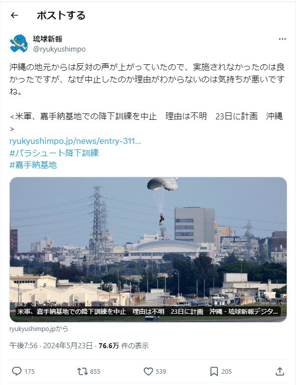https://x.com/ryukyushimpo/status/1793596781089206365