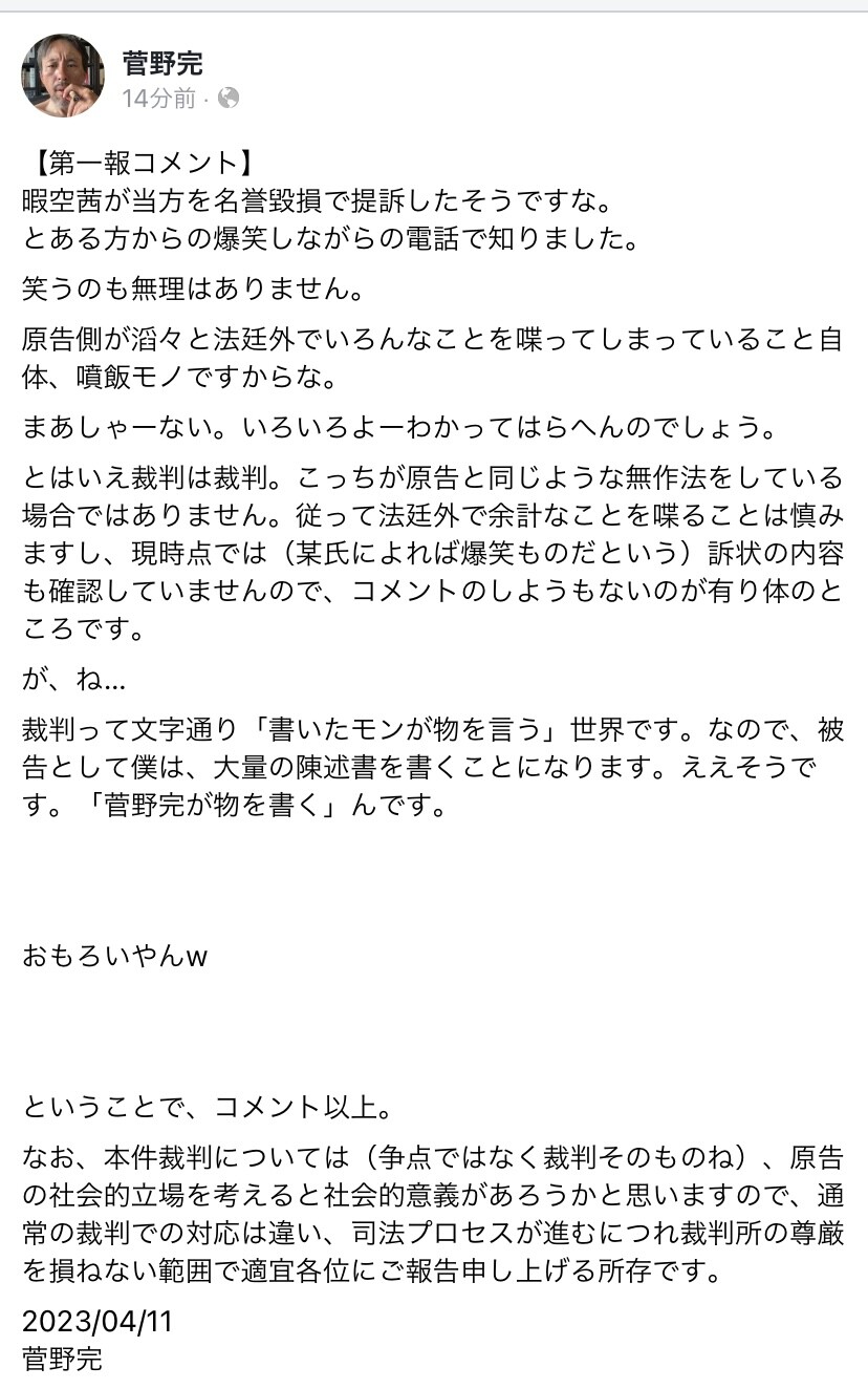 石丸叩きの暇空は嫌いだけど、菅野完みたいに、単なるポーズでハンガーストライキするような奴はもっと嫌いだからコレは暇空ナイスだね。