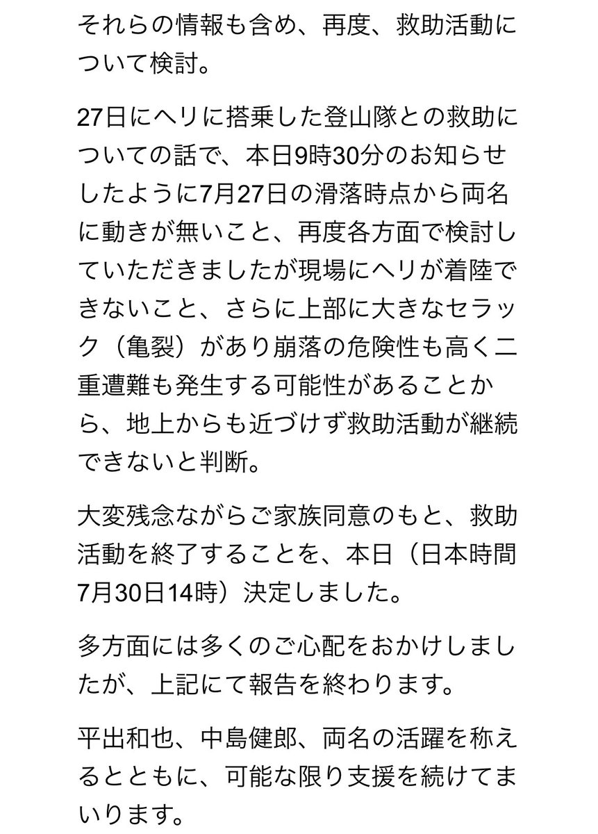 パキスタンにある世界第2の高峰K2(8611メートル)で滑落した、いずれも山岳カメラマンでクライマーの平出和也さん(45)=長野県出身=と中島健郎さん(39)=奈良県出身=について、2人が所属する登山用品販売の石井スポーツは30日、救助活動を打ち切ったとホームページ上で発表した。