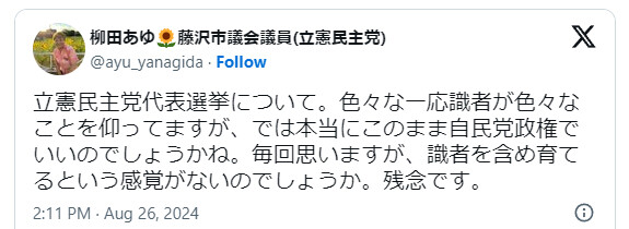 立憲民主党代表選挙について。色々な一応識者が色々なことを仰ってますが、では本当にこのまま自民党政権でいいのでしょうかね。毎回思いますが、識者を含め育てるという感覚がないのでしょうか。残念です。