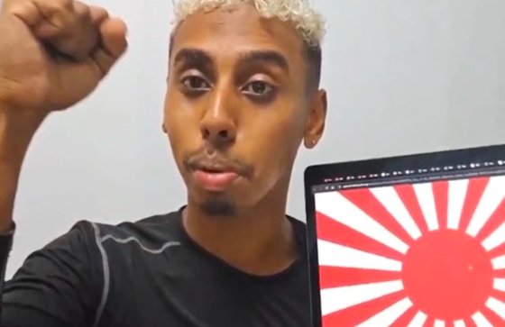 #【写真】旭日旗を見せながら独島を竹島と呼んだ米国のユーチューバー