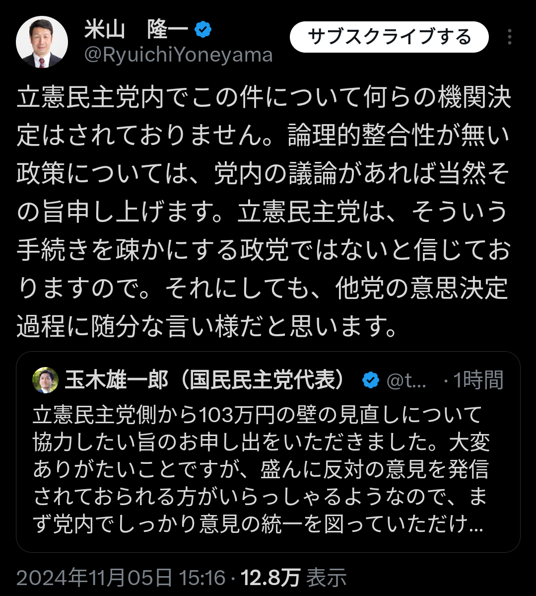 https://x.com/tamakiyuichiro/status/1853680360061825357