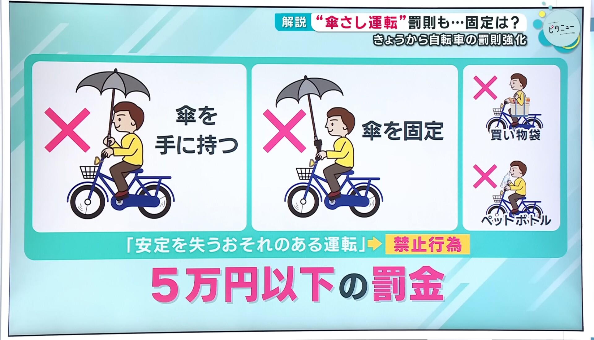 ・傘さし運転をすると3か月以下の懲役、5万円以下の罰金(固定しても違反)