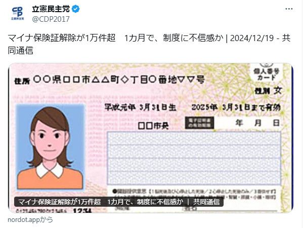マイナ保険証解除が1万件超 1カ月で、制度に不信感か | 2024/12/19 - 共同通信