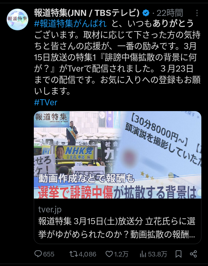 °ìÉô¤Î¥æ¡¼¥¶¡¼¤Ï¡ÖTBSÊóÆ»ÆÃ½¸¤ÎÊиþÊóÆ»¤Î¤»¤¤¤ÇÀ¯¼£²È¤¬Ì¿¤òÁÀ¤ï¤ì¤¿¡×¤È¤·¡¢ÈÖÁȤÎÊóÆ»»ÑÀª¤òÈãȽ¤·¤Æ¤¤¤Þ¤¹¡£