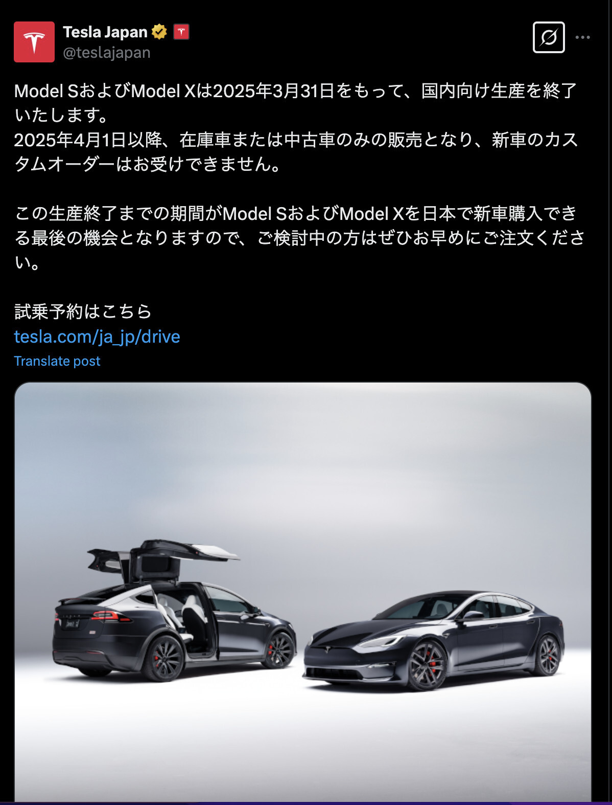 高級EVモデル「モデルS」と「モデルX」の日本向け生産を終了すると発表しました。