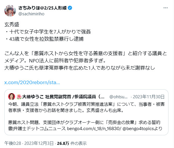 こんな人を「悪質ホストから女性を守る善意の支援者」と紹介する議員とメディア。NPO法人に前科者や犯罪者多すぎ。