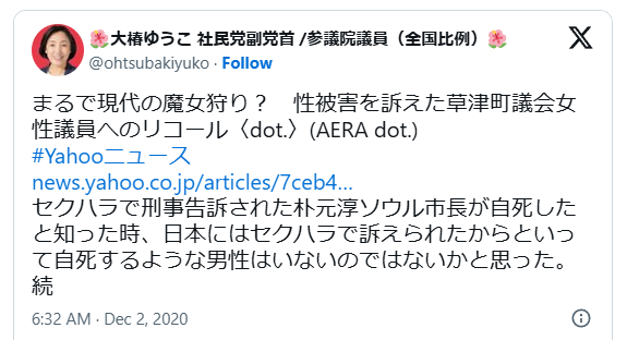 まともな精神で政治活動する女性は日本には居ないのではないかと思われるように誘導しているよね🥺