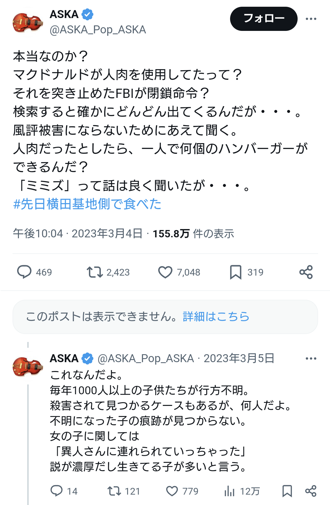 ASKA(親トランプ、親プーチン、大統領選不正選挙、Qアノン、プーアノン、ディープステート、ゴム人間陰謀論、参政党支持、反ワクチン、イベルメクチン、ギブハブ、スピリチュアル、反コオロギ食、ターボ癌、電磁波、酸化グラフェン、反5G、ビルゲイツ人口削減計画、小林製薬陰謀論、コロナは生物兵器、地球平面説、水素、オゾン水、ソマチッド、シェディング、アカシックレコード、グレートリセット 、新世界秩序(NWO)、UFO、人工地震、アドレノクロム、レプティリアン、ケムトレイル、マクドナルド人肉ハンバーガー、日航機事故は自衛隊の陰謀、ケネディ暗殺陰謀論、STAP細胞は存在する、エプスタインは生きている、月は人工物、巨人は実在する、安倍銃撃事件の犯人は山上じゃない)