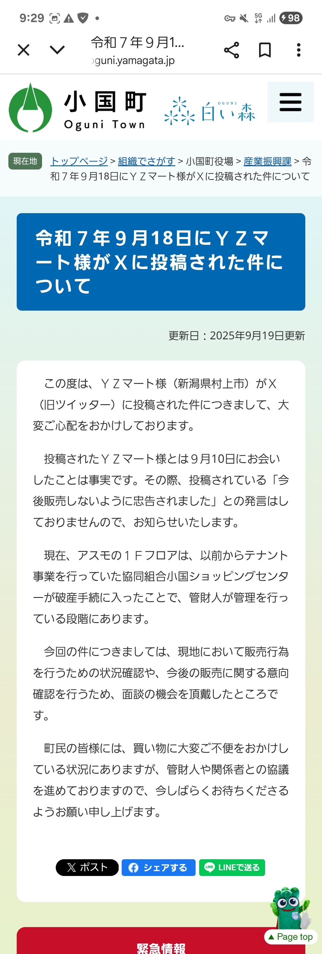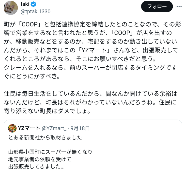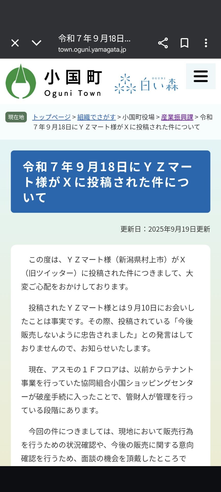 »³·Á¸©¾®¹ñÄ®¤ÇÍ£°ì¤Î¥¹¡¼¥Ñ¡¼¡Ö¶â½½¡Ê¤«¤Í¤¸¤å¤¦¡Ë¾¦Å¹¡×¤¬µÙ¶È¤·¤¿¤¿¤á¡¢¿·³ã¤Î¥¹¡¼¥Ñ¡¼¡ÖYZ¡Ê¥ï¥¤¥·゙¡¼¡Ë¥Þ¡¼¥È¡×¤¬½ÐÄ¥ÈÎÇ䤷¤¿¤È¤³¤í¡¢Ä®Ä¹¤«¤éº£¸åÈÎÇ䤷¤Ê¤¤¤è¤¦¤ËÃé¹ð¤µ¤ì¤¿¤È¡¢YZ¥Þ¡¼¥È¤¬X¤ÇÅê¹Æ¤·¡¢ÏÃÂê¤Ë¤Ê¤Ã¤Æ¤¤¤ë¡£