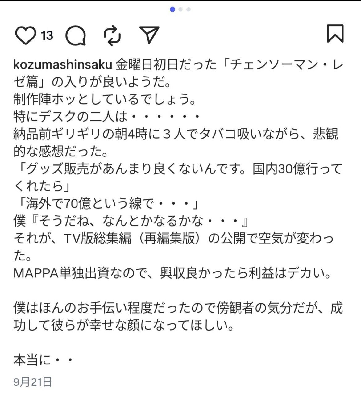 【朗報】57億突破の映画「チェンソーマン」、MAPPAの予測では最大興収30億だったwwww