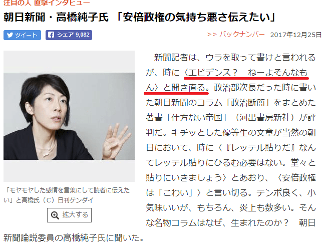 「 エビデンス ? ねーよ そんな も ん 」でおなじみ朝日新聞高橋純子さんの駄文ですね。