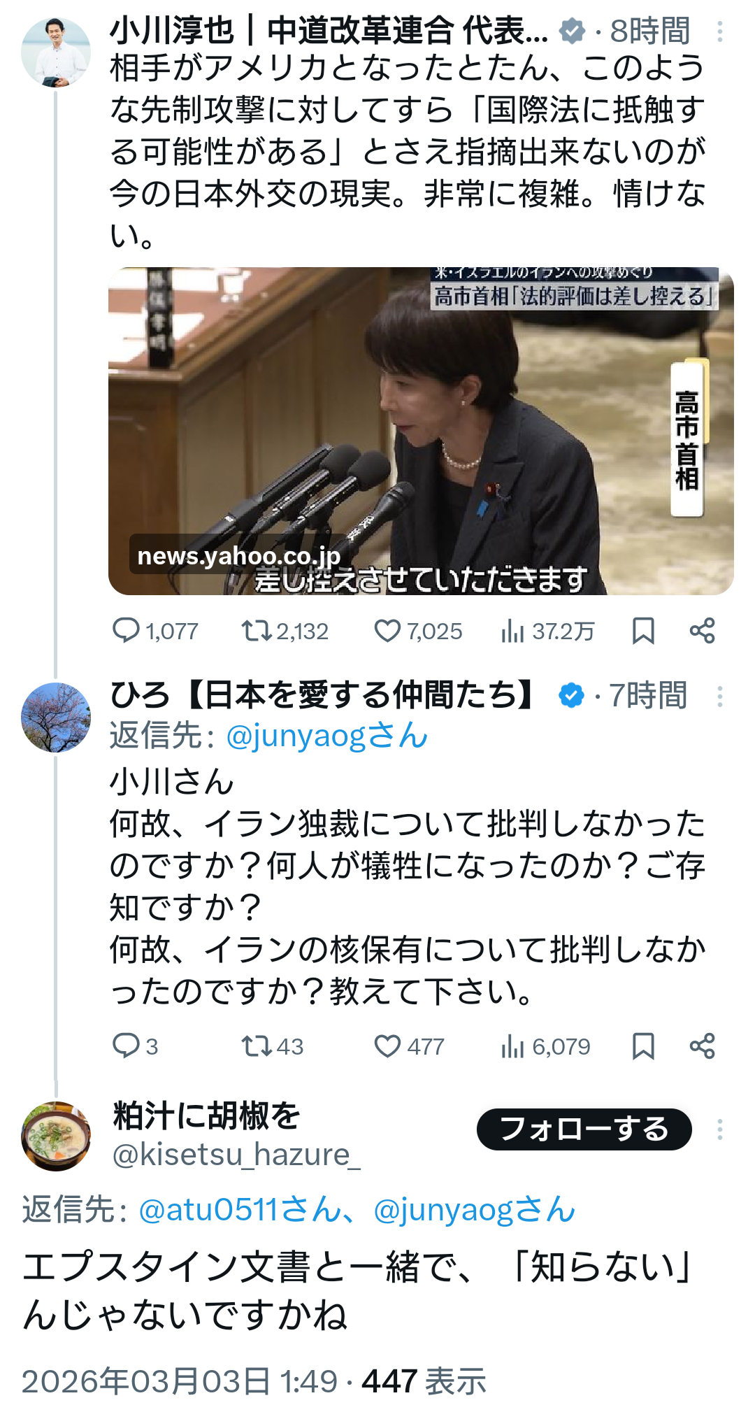 湾岸諸国も入って無差別攻撃に対する非難声明出てるけど小川はどーすんの?イランが正当だと主張できるの?
